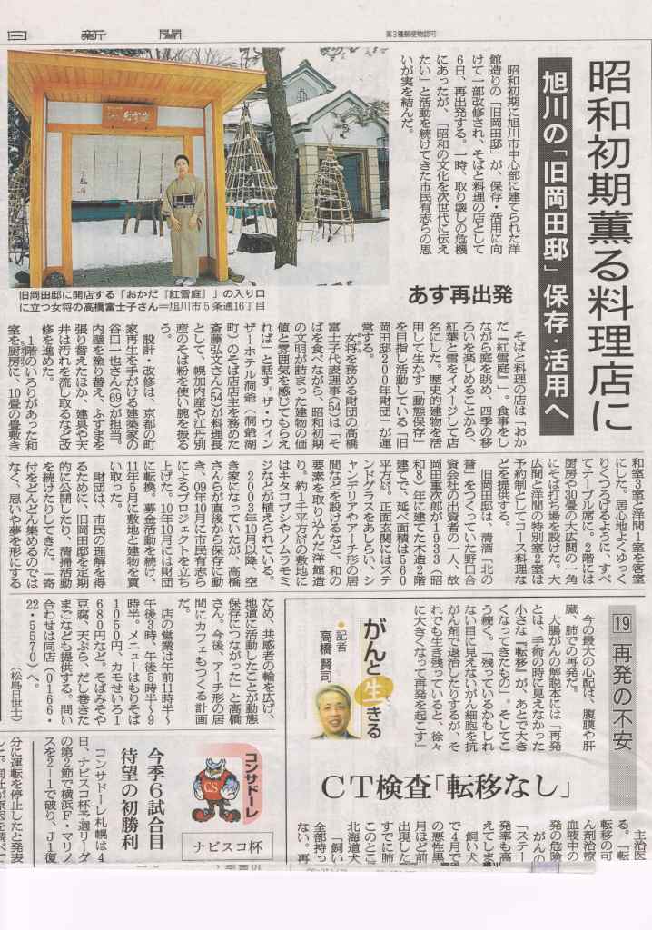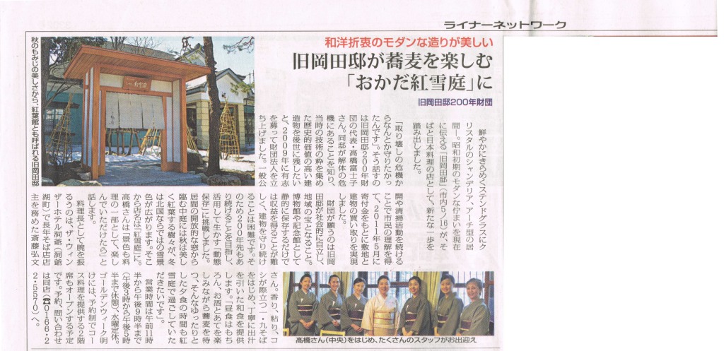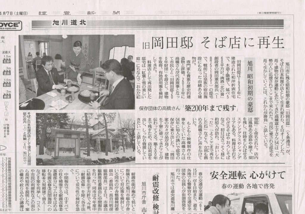 4月7日 読売新聞掲載記事「旧岡田邸 そば店に再生」